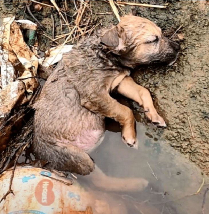 The world often presents us with stark reminders of its indifference, moments that challenge our belief in inherent goodness. Such was the scene that greeted a passerby on a dreary Tuesday morning: a tiny, motionless form, barely distinguishable from the refuse it lay amidst, submerged in a muddy ditch. This heart-wrenching sight, captured in the grim reality of the image above, was that of a puppy, abandoned and left for dead, its fragile life ebbing away in the cold, murky water. The initial instinct might have been to avert one’s gaze, to rationalize the impossibility of intervention. Yet, on this particular day, fate had a different plan, intertwining the destiny of a forgotten creature with the compassionate heart of an unexpected hero. What unfolded next was a series of events, both harrowing and heartwarming, that would prove the resilience of life and the profound impact of human kindness.