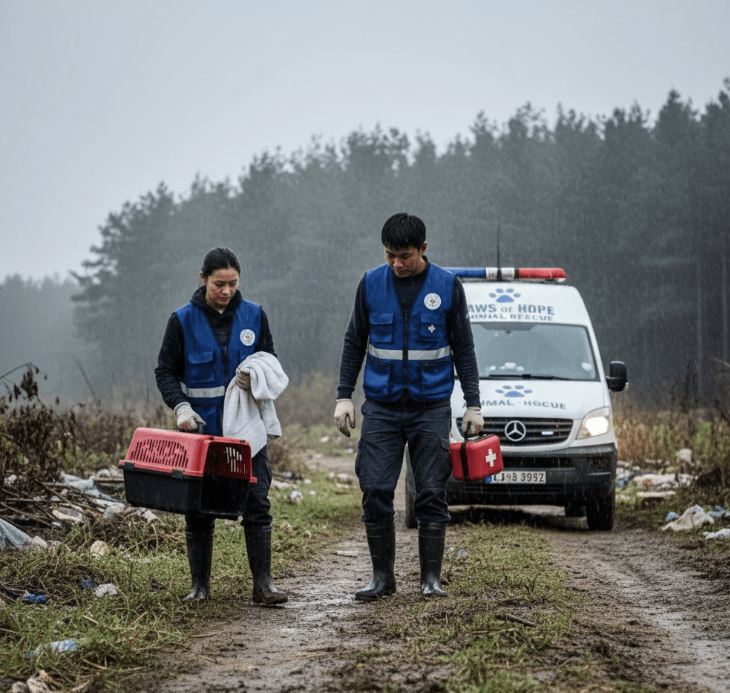Upon their arrival, the sight was grim. The puppy, now wrapped in Mr. Tan’s jacket, was barely clinging to life. The rescue team, a husband-and-wife veterinary duo named Dr. Lee and Sarah, immediately set up a makeshift clinic by their vehicle. They carefully examined the puppy, noting its severe hypothermia, dehydration, and a dangerously low heart rate. “He’s fading fast,” Sarah murmured, her voice laced with concern, as Dr. Lee began administering warmed fluids and gentle massage. The situation seemed bleak, yet they refused to give up.